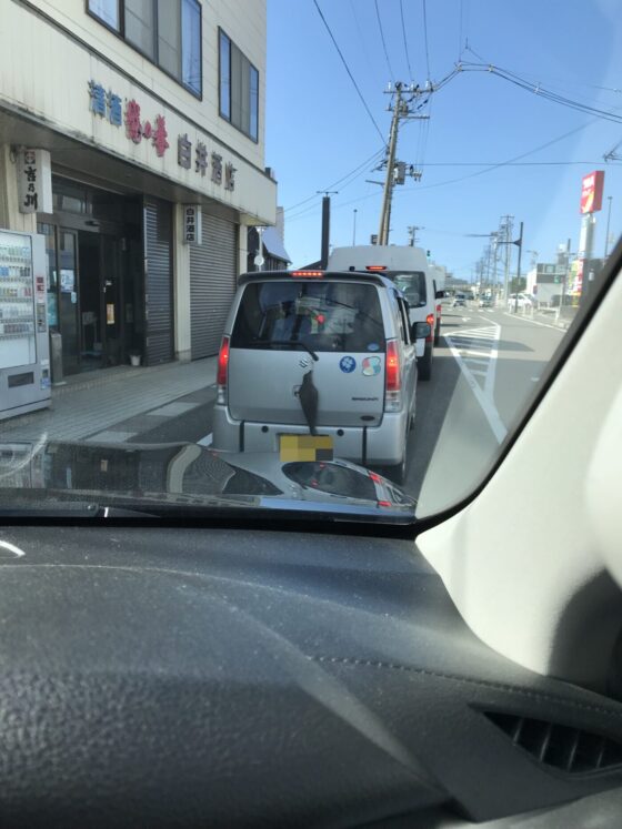 前の車のワイパーのとこ。なんかぶら下がってる。